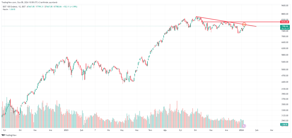 Günlük zaman diliminde Bist 100 grafiğine baktığımızda ilk önemli direnç bölgesi 7.890 civarına denk geliyor. Bu bölgenin üzerinde günlük kapanışların gelmesi durumunda diğer direnç alanımız yatay bölgede 8.125 noktası olacaktır. Günlük grafikte düşen trendin üst bölgesi olduğu için ilk direnç alanımız olan 7.890 bölgesi son derece kritik.